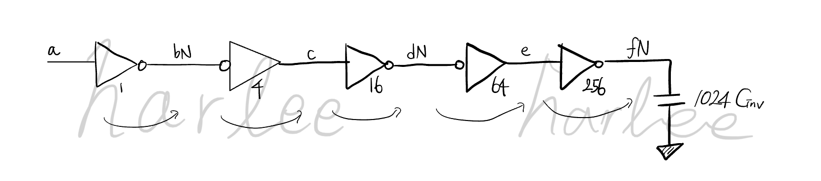 최소 딜레이를 얻기 위해서 각 stage 별로 구동력이 동일한 배수(factor)로 증가하는 inverter들의 체인으로 stage를 나누어 본다.