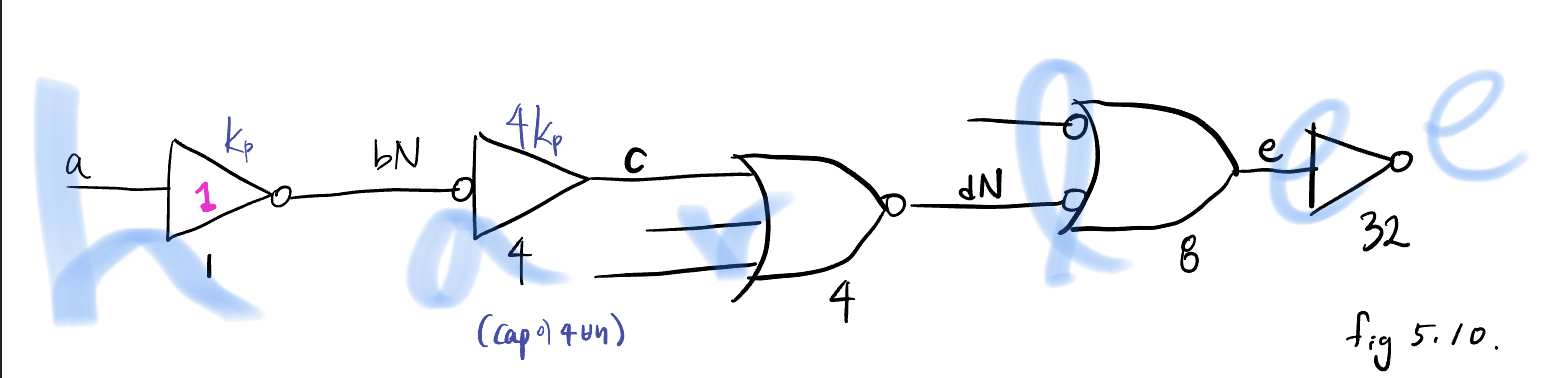 - a, bN, c, dN, e 스테이지는 각각 unit size inv 와 동일한 구동력을 갖돼, input cap이 1, 4, 4, 8, 32배 커지도록 사이징 되어 있다.