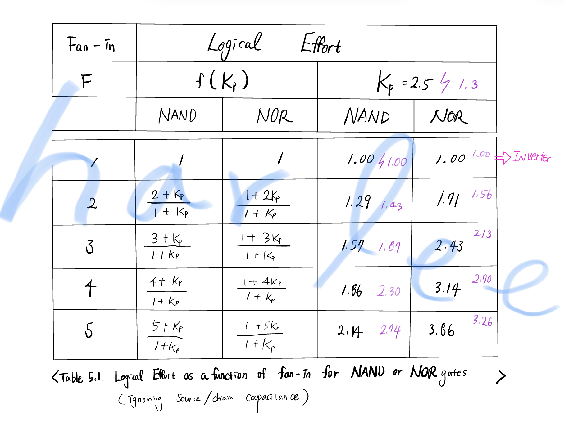 Multiple Input NAND 와 NOR 의 Logical Effort 표