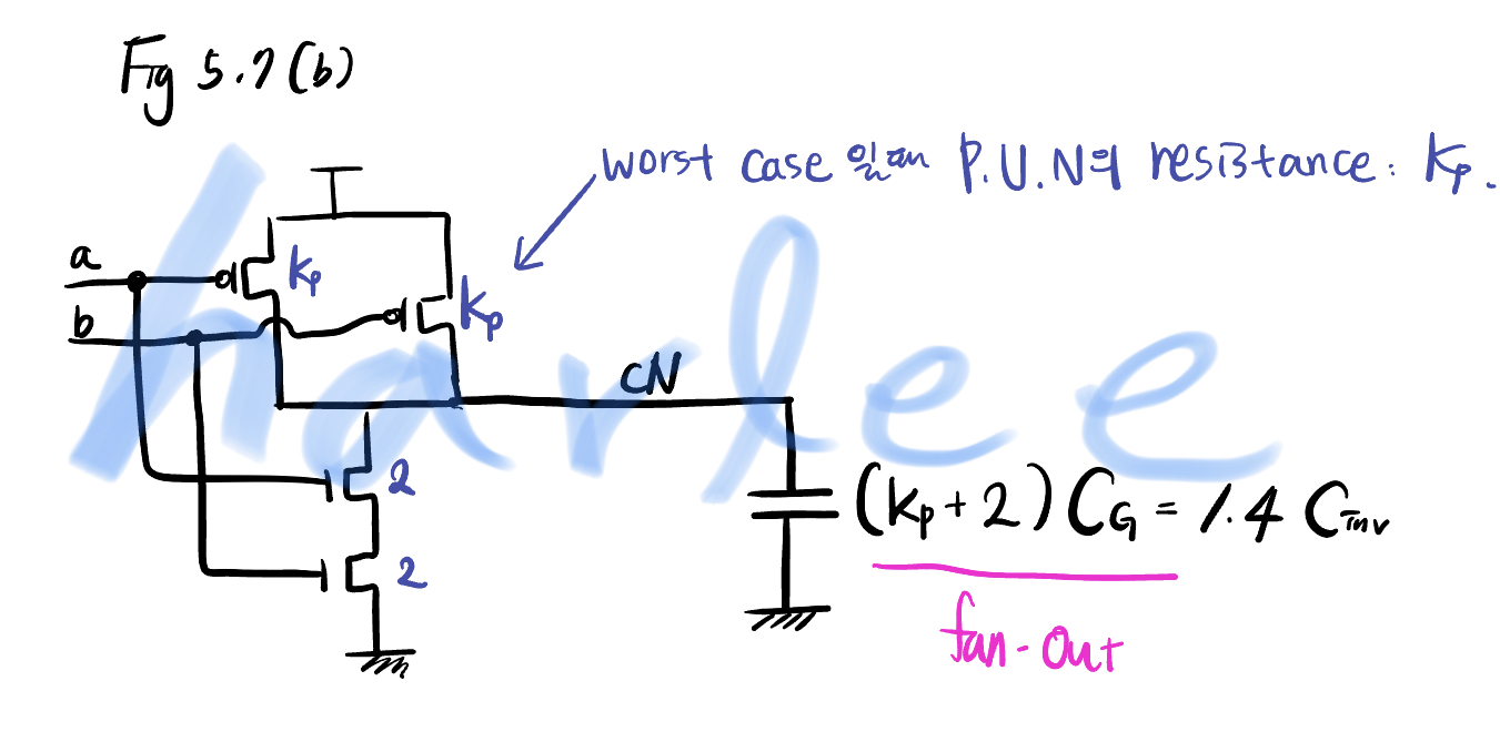 pull-up network의 worst case resistance는 입력이 한 개만 켜졌을 때이다. ( 보통 딜레이 계산할 때 우리는 worst case delay를 고려한다. )
