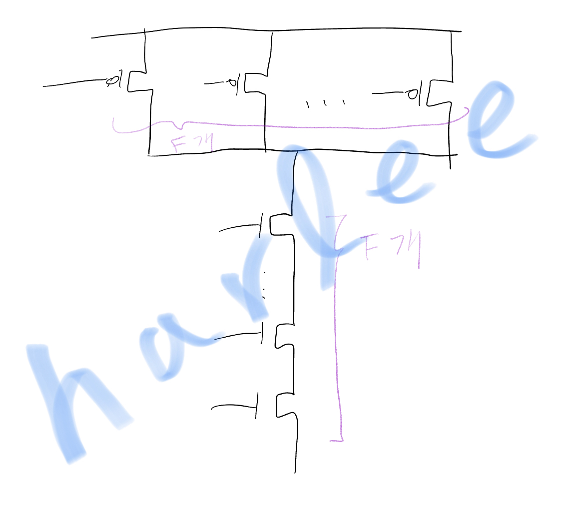 Pull-Down Network는 켜지려면 모든 nmos가 다 켜져야해요. 왜냐하면 F개 nmos들이 전부 직렬로 연결되었기 때문이에요.