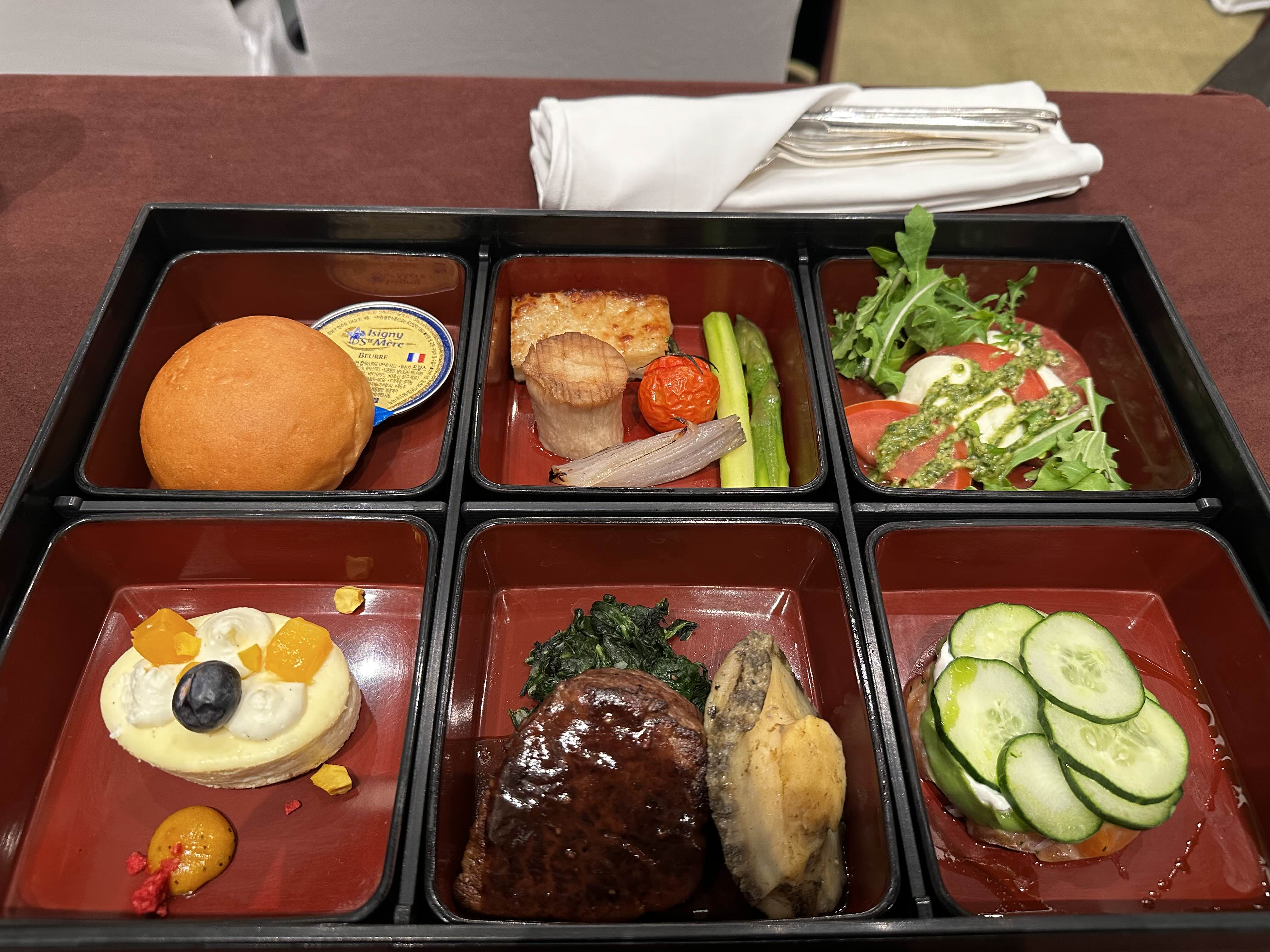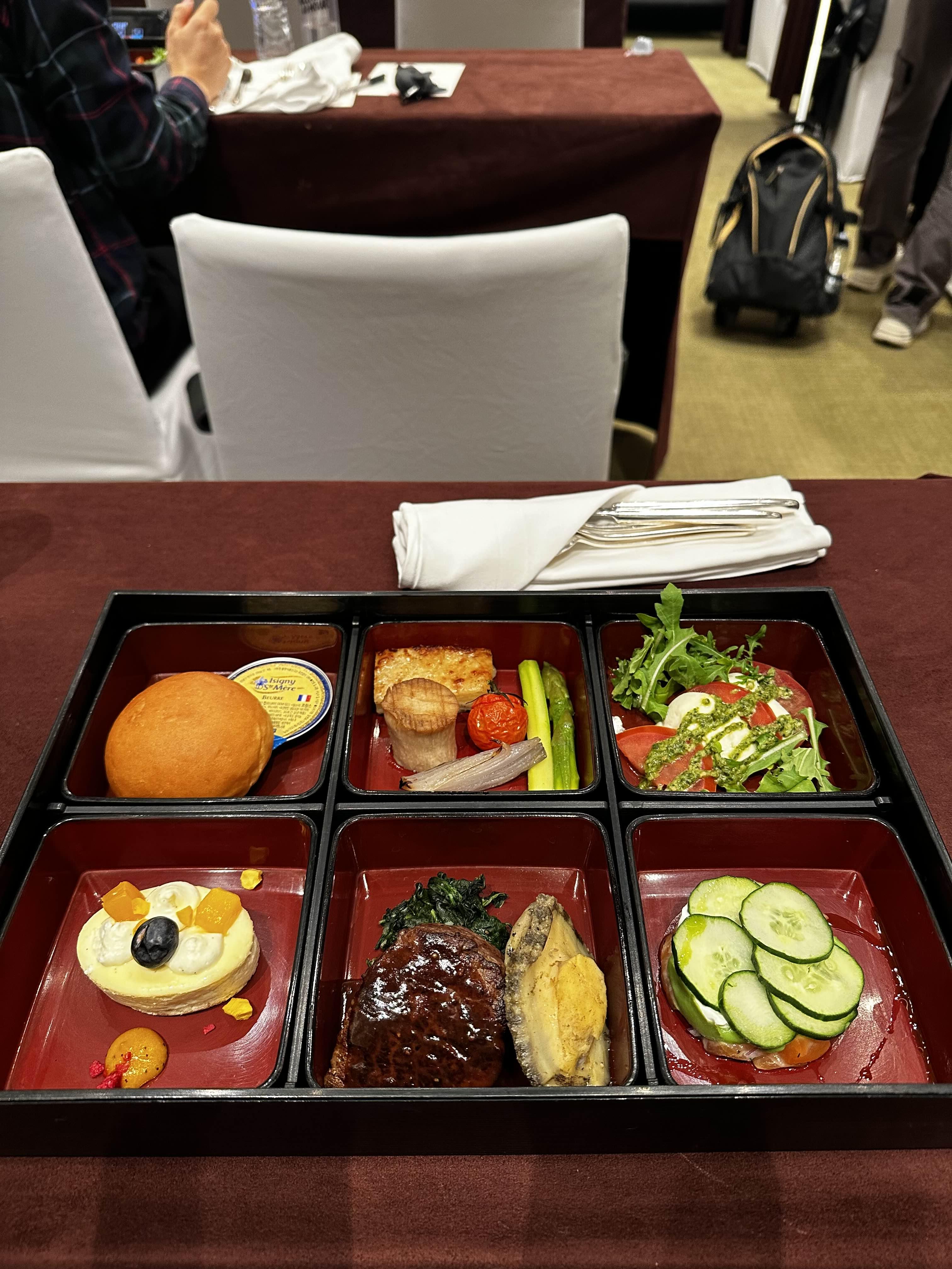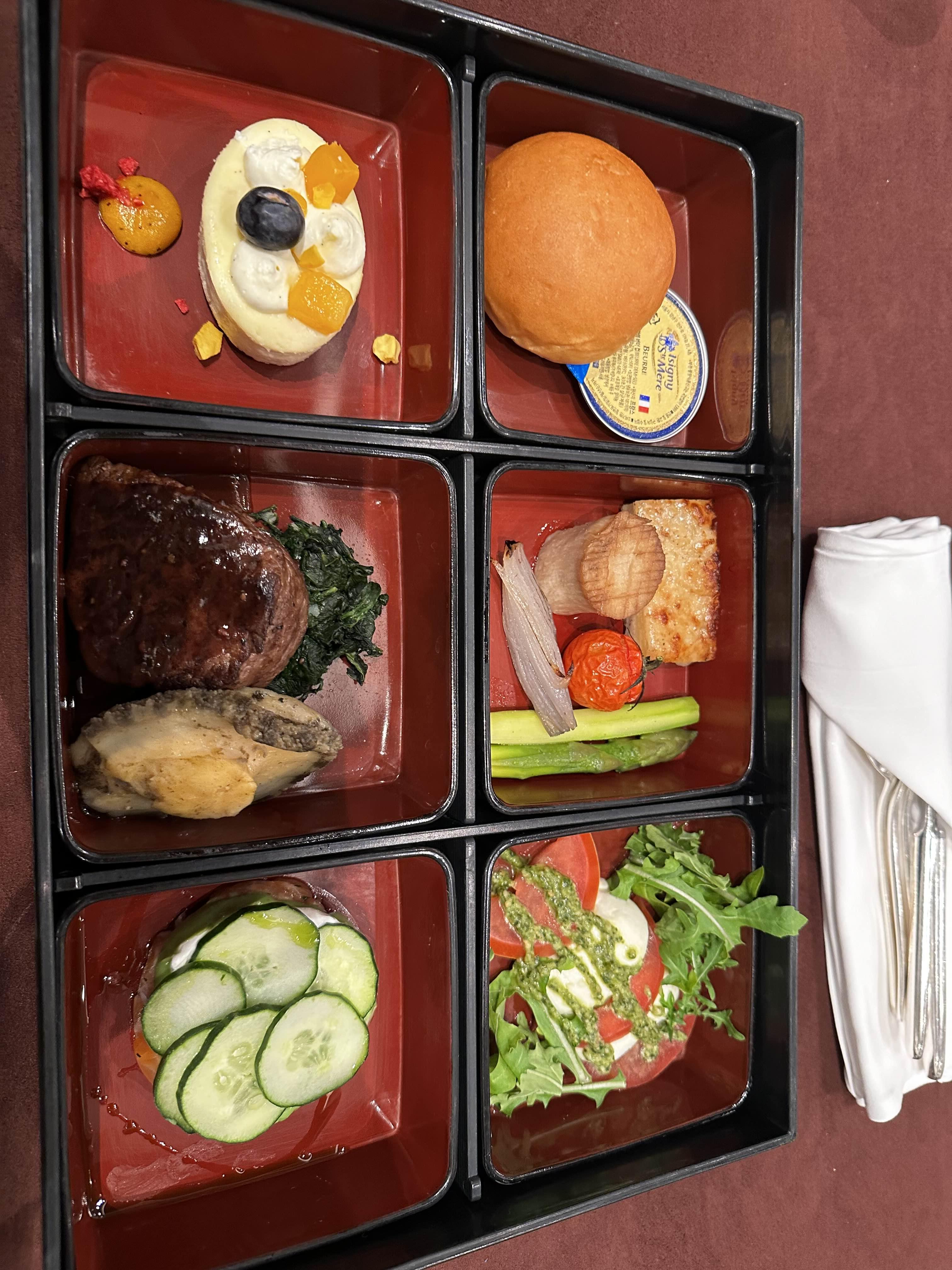 스테이크, 전복, 연어등 육류가 많은 도시락이었다. (행복)