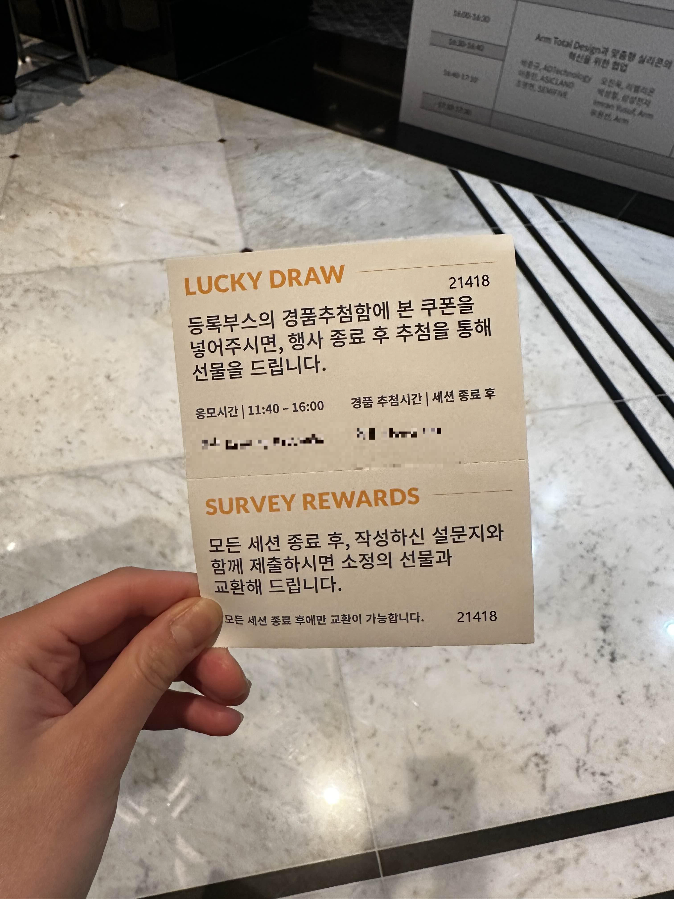 이름표에는 러키드로우를 위한 쿠폰이 포함되어 있으며 식사장소가 표시되어 있다.